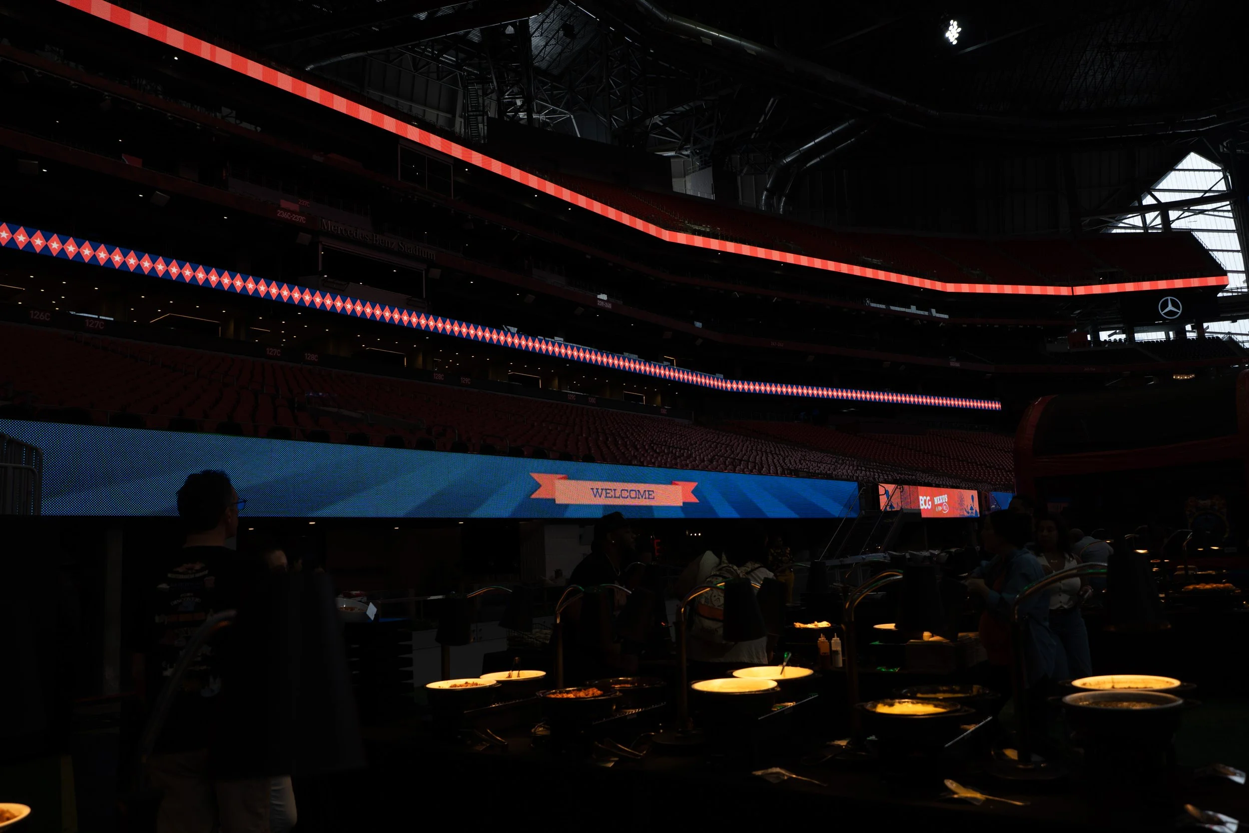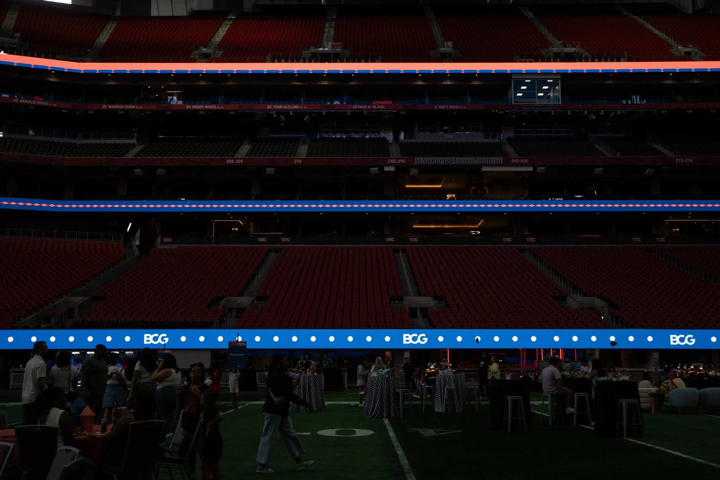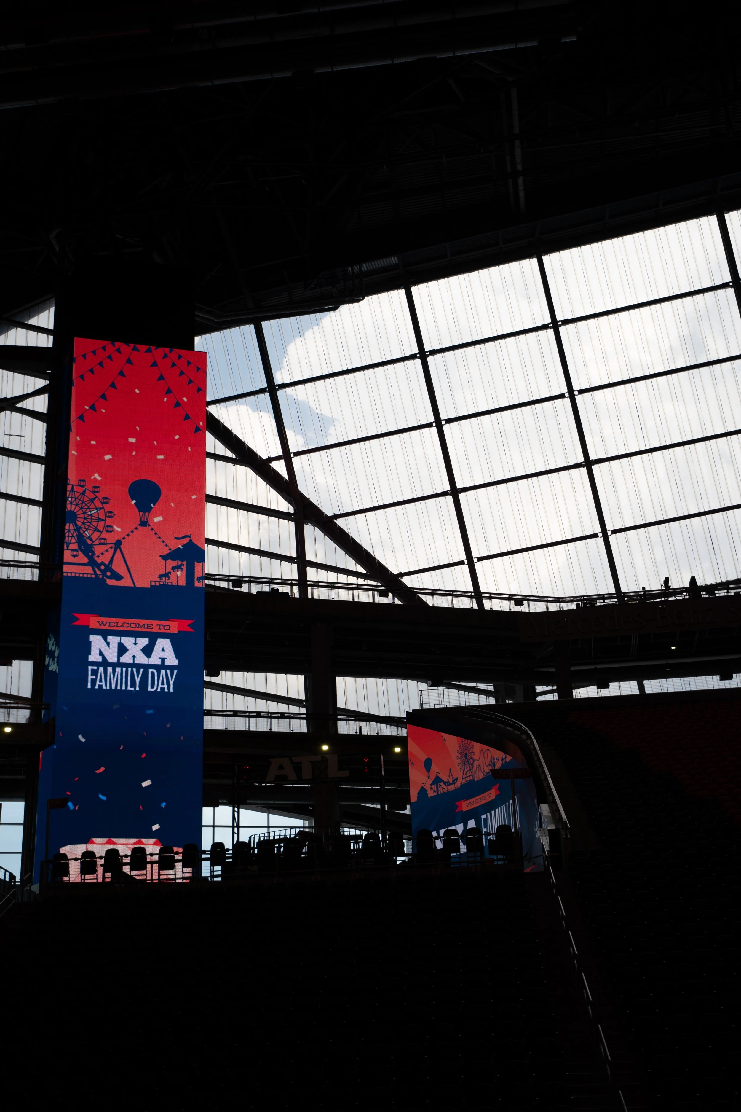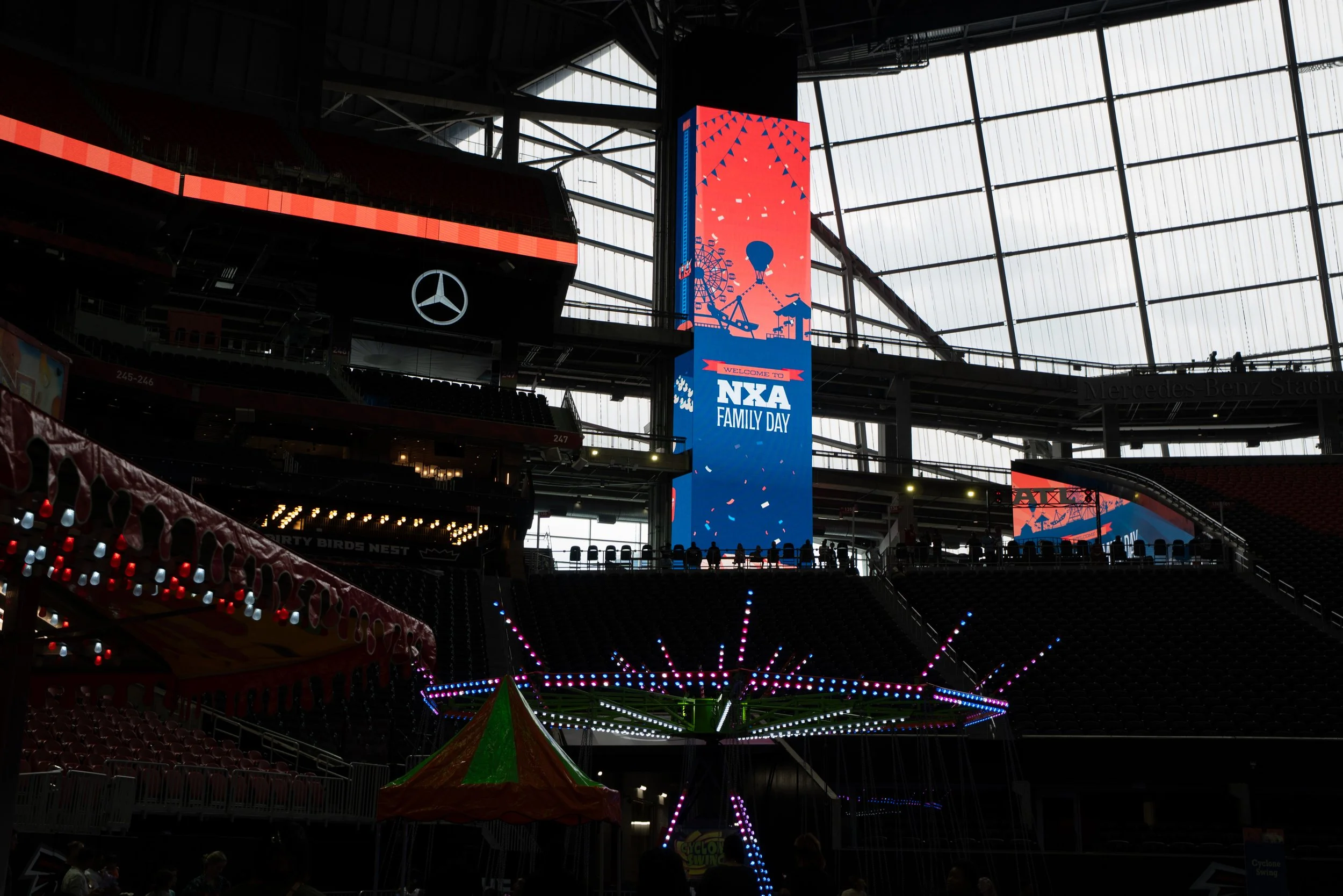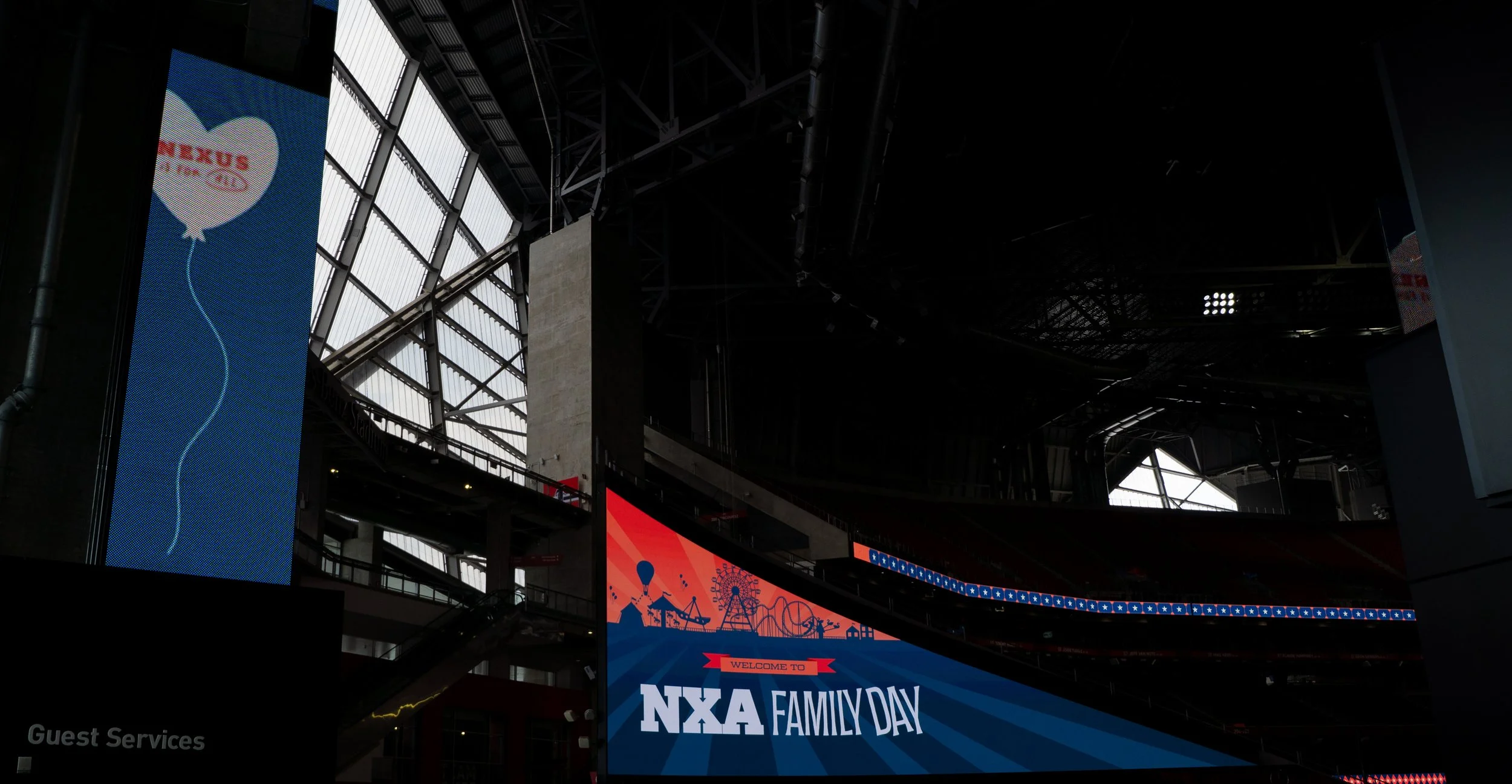 Design branding assets for NXA Family Day at Mercedes Benz Stadium, including: registration site, Slack/Salesforce banners, slides, face cut-out, and event signage.
